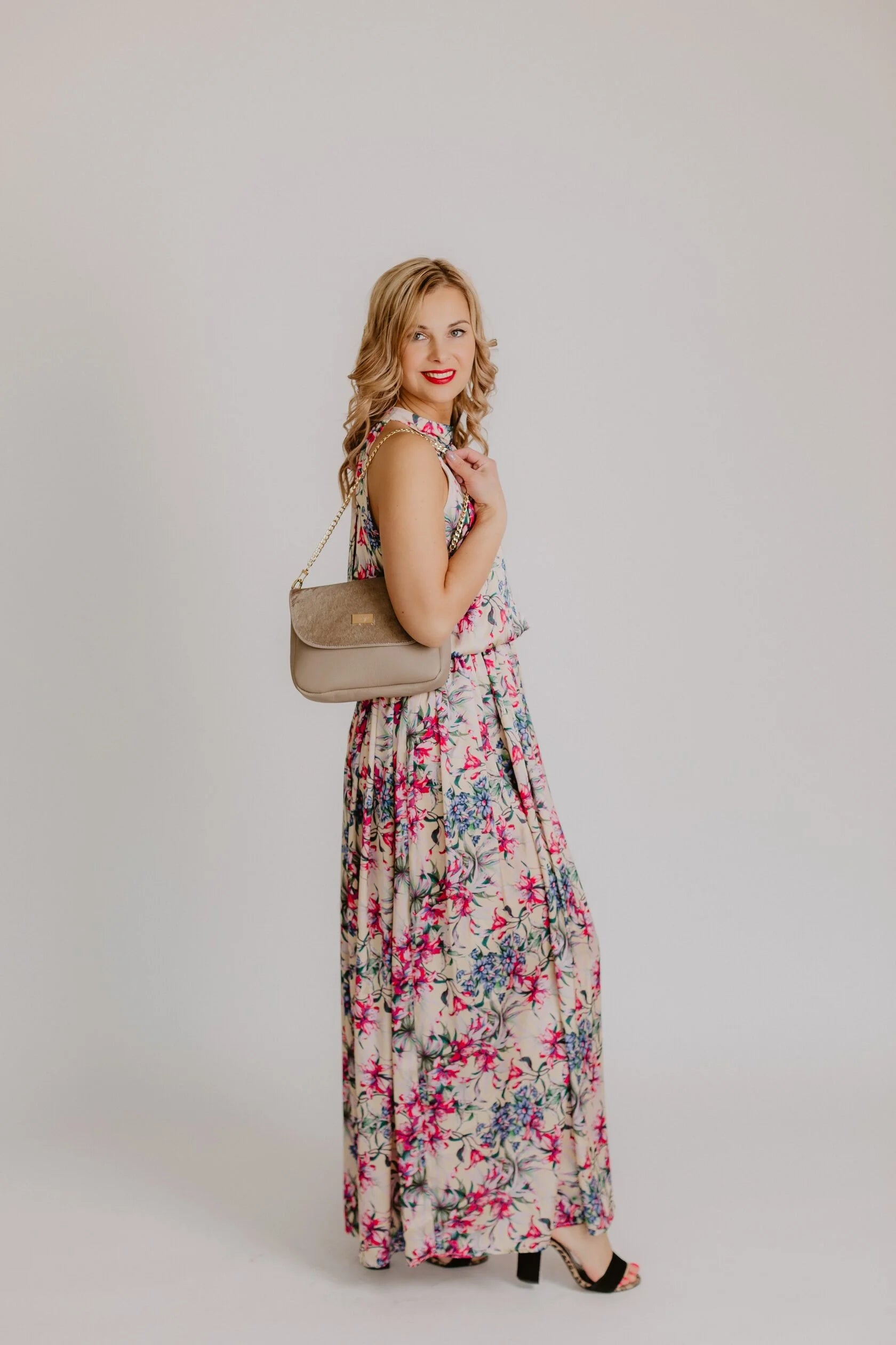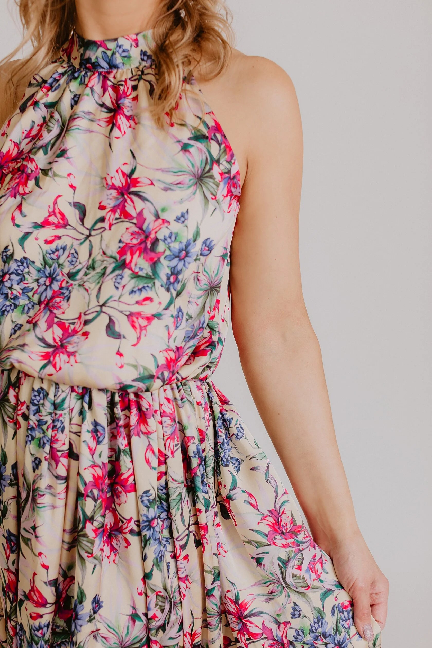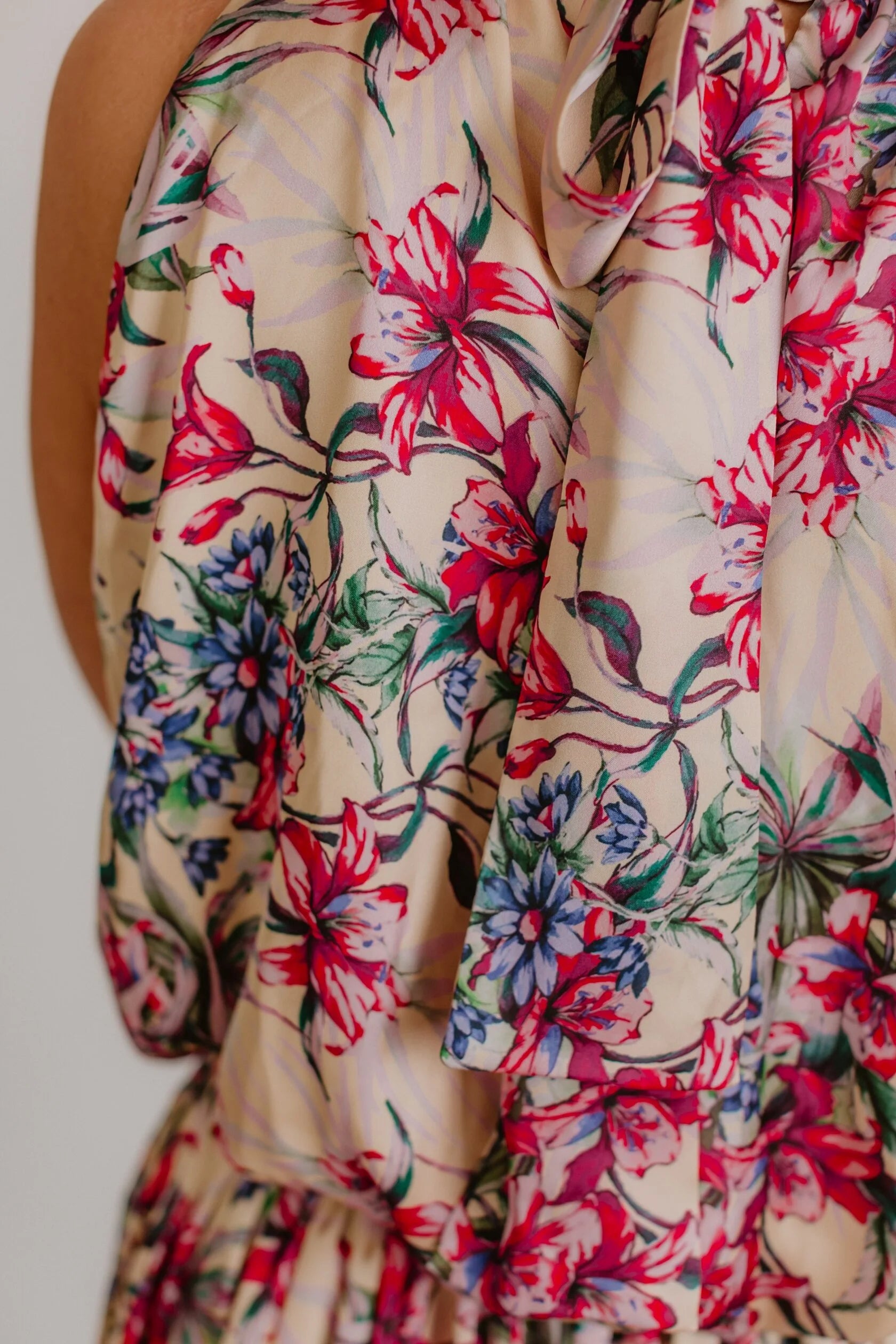 Beige with fuchsia lilies and blue flowers